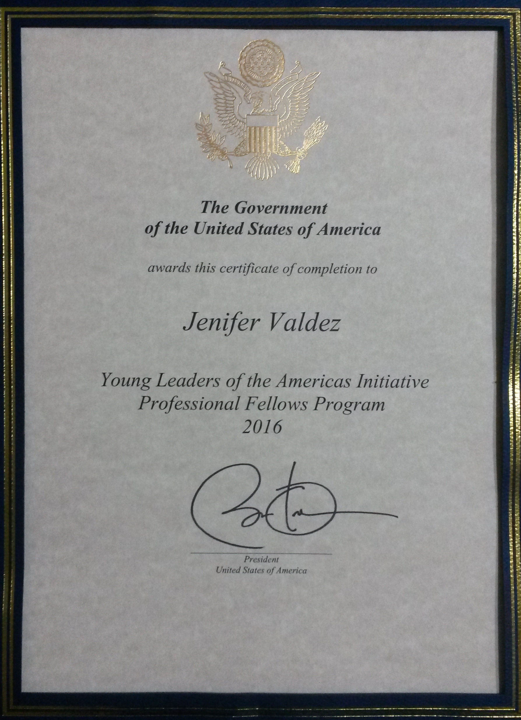 CERTIFICATE OF THE USA GOVERMENT – COMPLETION #YLAI PROGRAM
