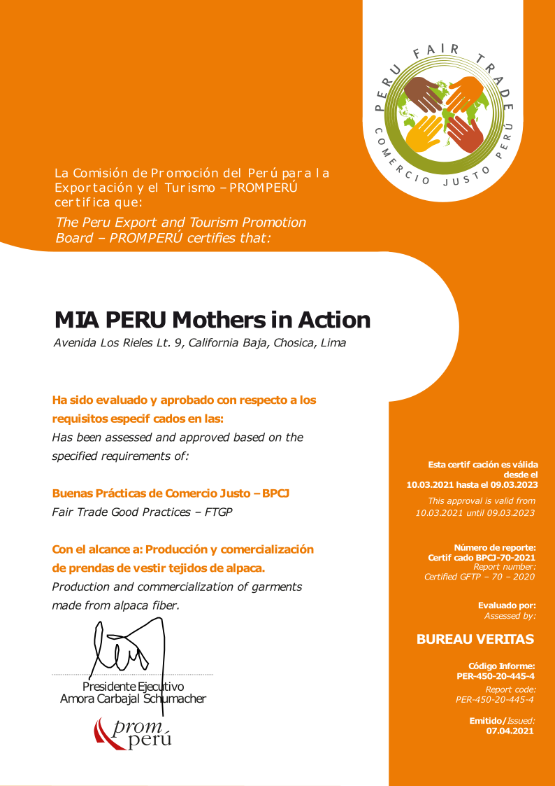 The Good Fair Trade Practices – GFTP members of the Peru Export and Tourism Promotion Board – PROMPERU, after many years of meticulous supervision of our entire production system that includes purchase of raw materials until the delivery of the final product to our clients and our accomplishment of the correct development of the 10 basic principles of fair trade, we have once more proudly obtained the renewal of our certificate. We are currently conducting a meticulous and professional internal self-audit to ensure proper Fair Trade practices within our company. We have been fair trade certified since the begining until today.